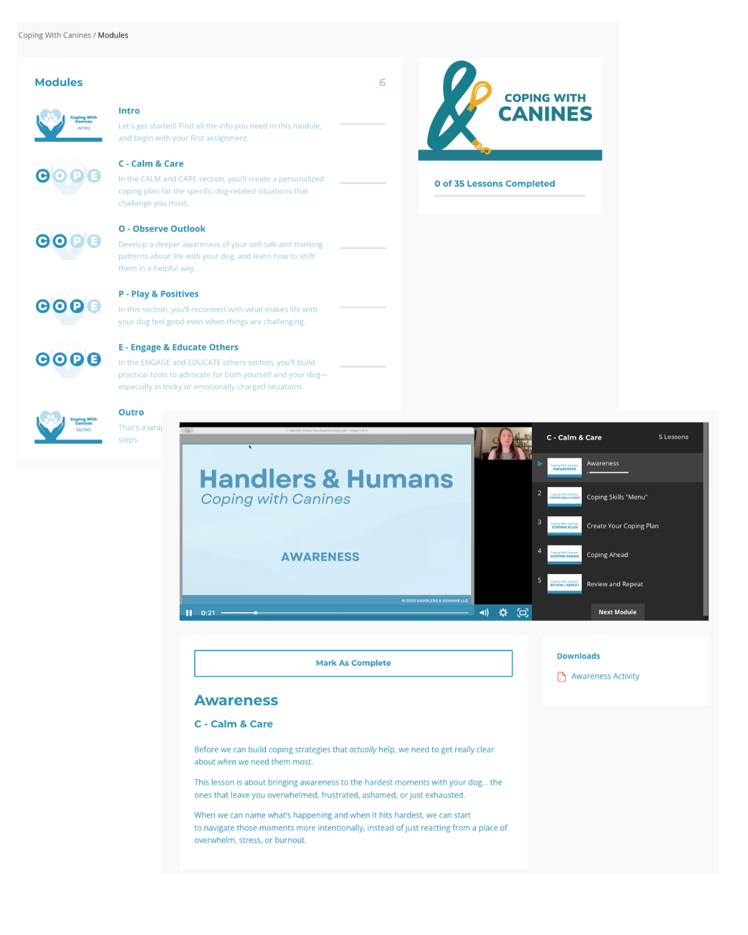 Using the COPE framework, the full Coping With Canines curriculum pairs video lessons, guided reflection prompts, and hands-on exercises to help you actually apply what you learn.