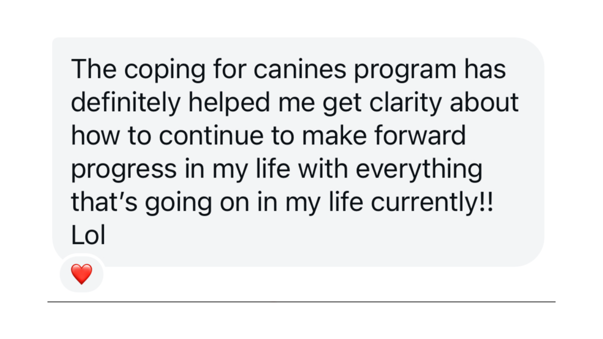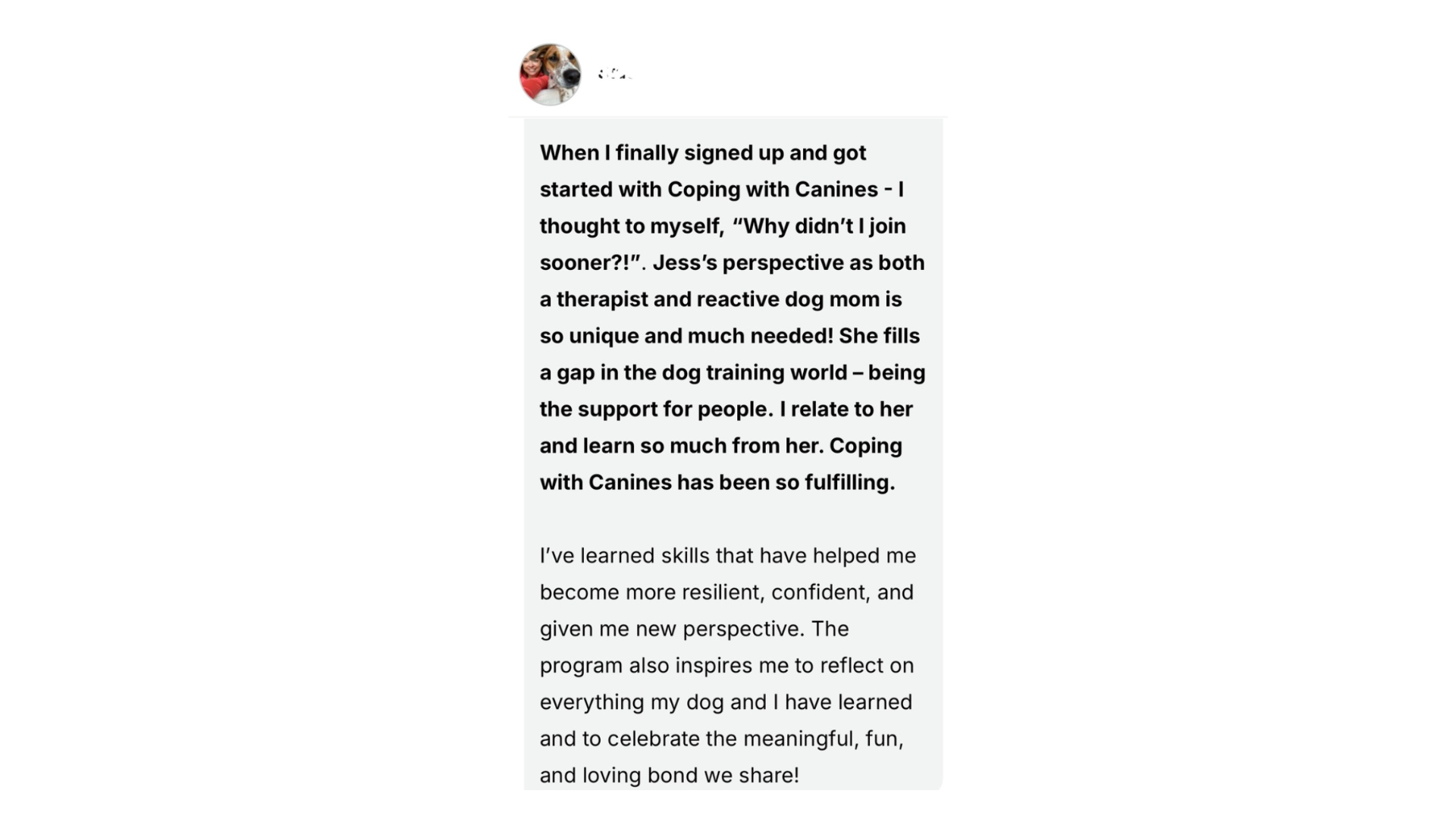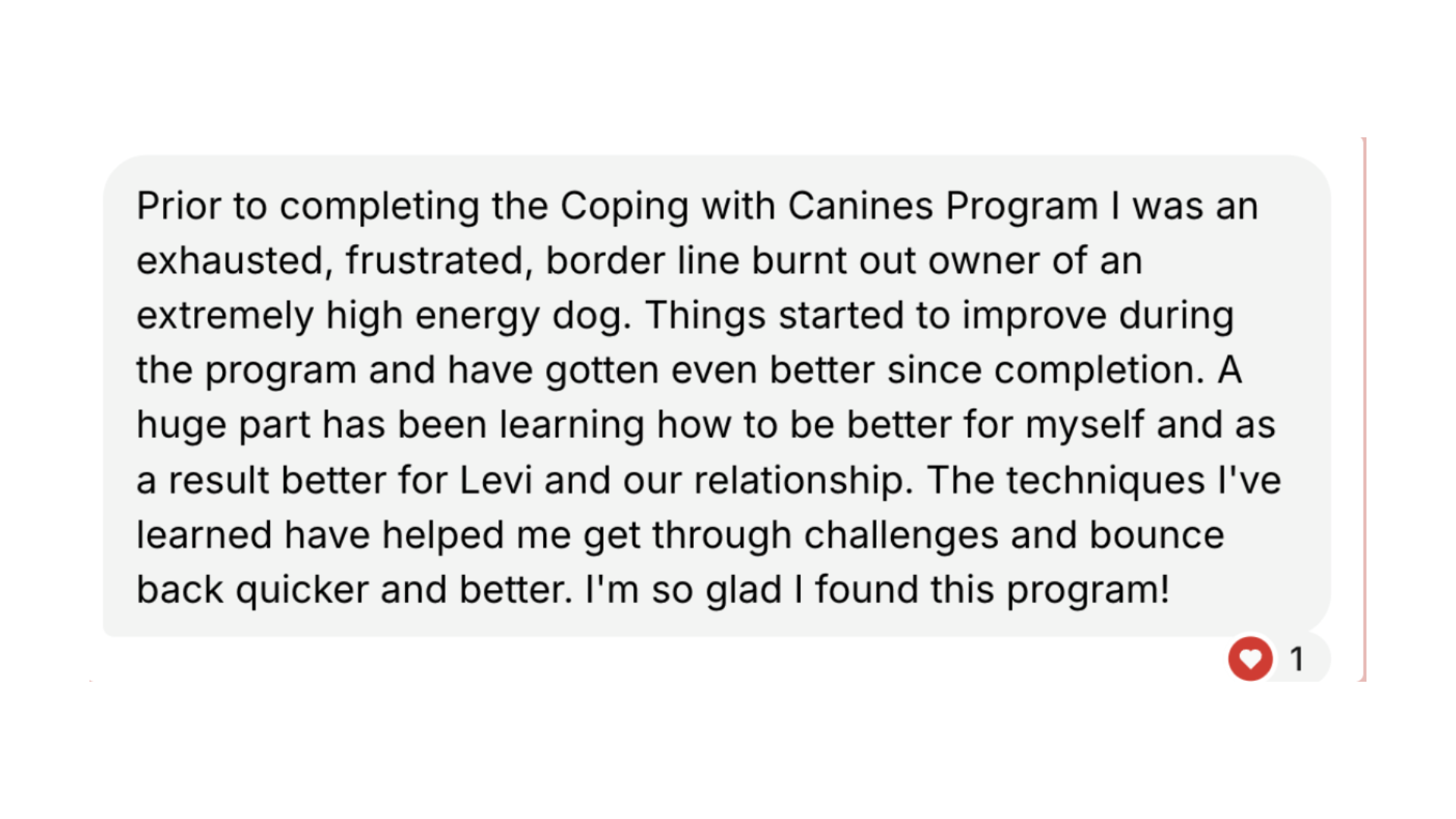 For dog people who want expert-led group support and a structured program to help them build resilience in their relationship with their dog, the Course Tier goes beyond community... it gives you real, actionable mental health tools designed for dog lovers.