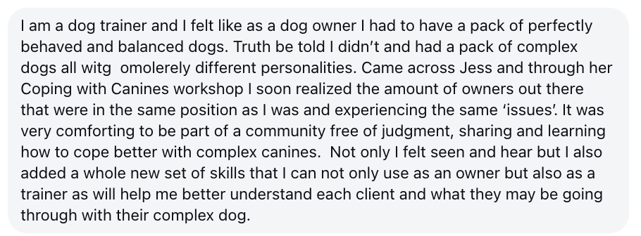 "When Max became anxious and reactive, I had no idea what to do. I felt as though I had done something wrong. I found Jess’s course accidentally looking for yet another trainer to help me. It was the first time I felt seen and heard, not blamed.