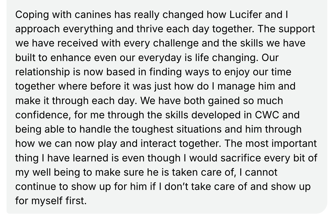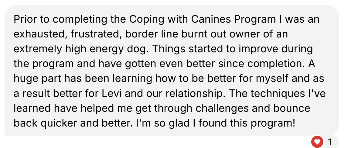"I struggled with coping with my reactive rescue dog Chester for several years before finding the Coping with Canines community. The group calls, peer support, and one-on-one feedback from Jess have been life-changing for Chester and me. Chester's reactivity made me feel really embarrassed and ashamed, but here in the group I have learned to have more compassion and empathy for myself dealing with a dog like Chester. I no longer feel shame. I expect that more rough patches may come in the future, but