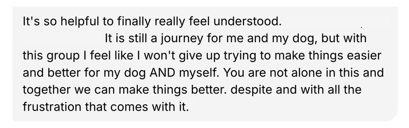 You get access to live group calls, a supportive discussion space, and community challenges that help you feel less alone and more confident navigating life with your dog.